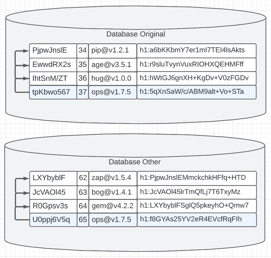 This is never a problem when the hash information for a given key is the same in both databases. However, there is a chance that the hash for the same key can be different in each database. Look at ops@v1.7.5 and see how a different hash value exists. The code for that dependency was changed between the time the original database was queried compared to when the other database was queried.