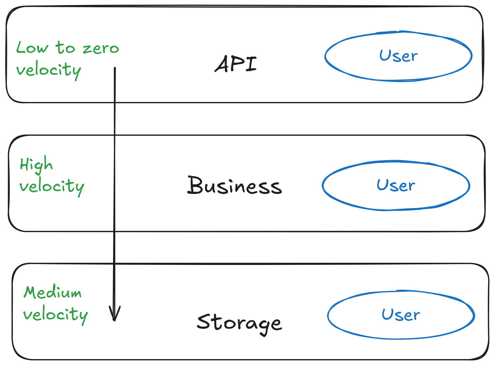 Many applications should have three major layers: API, Business, and Storage. Each of these layers have a different development velocity (the rate at which the code changes over time). The API layer has low to zero velocity, the business layer has high velocity, and the storage layer has medium velocity.