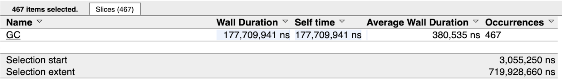 In this version of the program, the memory in-use on the heap stays at ~4 meg for the entire run of the program. To see stats about all the individual garbage collections that took place, use the selection tool and draw a box around all the blue lines.