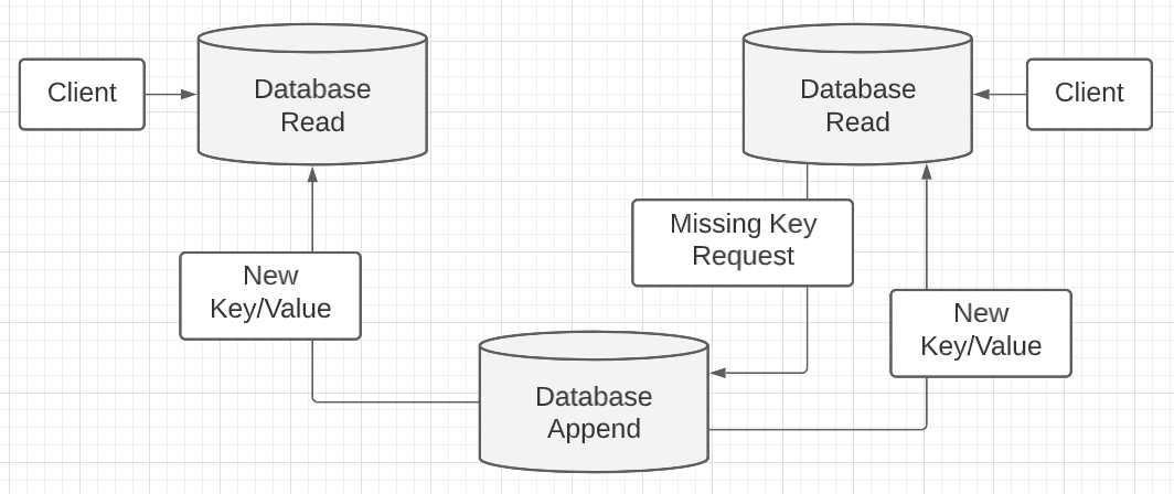 We could designate just one database for appending new records and have all the other databases for reading. If a read database has a missing key, it can send the request to the append database where it can perform the work. The new record could then be replicated to other databases.