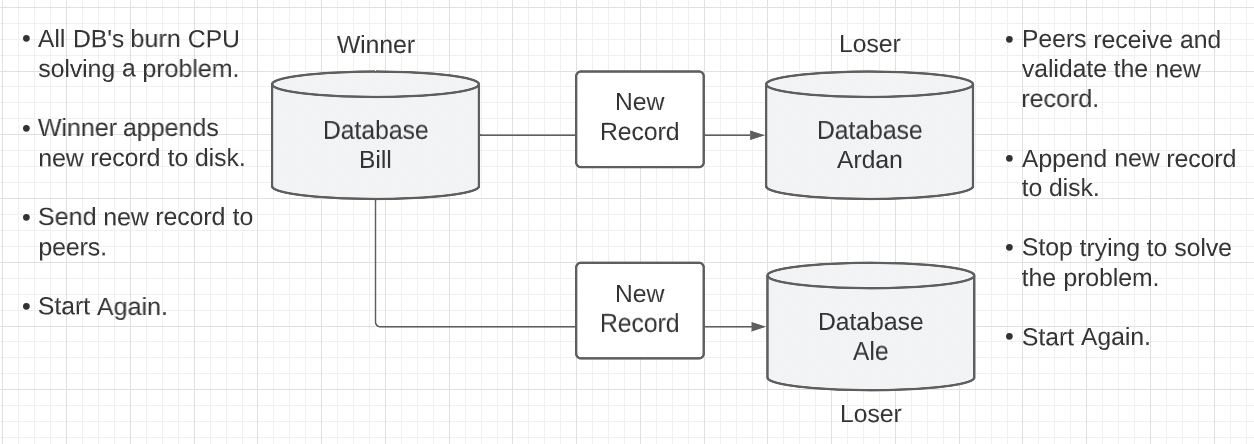 A new question presents itself, how can we guarantee each database is exactly the same when different appends are taking place on local databases? Each append increments the record number and is tied to the cryptographic audit trail for that database. We need some way to implement an atomic write across all the databases in this decentralized P2P network.