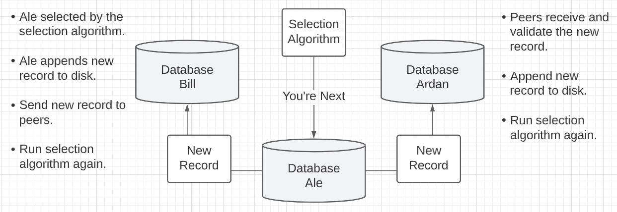 We could implement a simplified form of a consensus protocol that will coordinate which database gets to perform the next append to the database and sync that append across the P2P network before the next append. There are two popular consensus protocols that we could use to model our system, Proof of Work (PoW) and Proof of Authority (PoA).