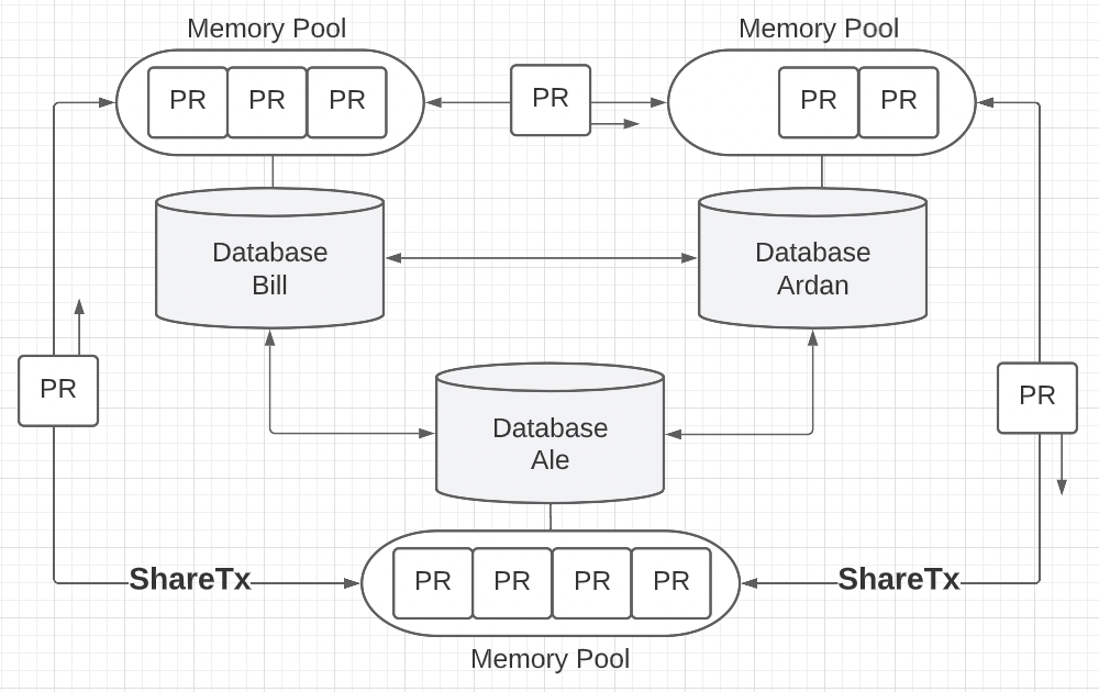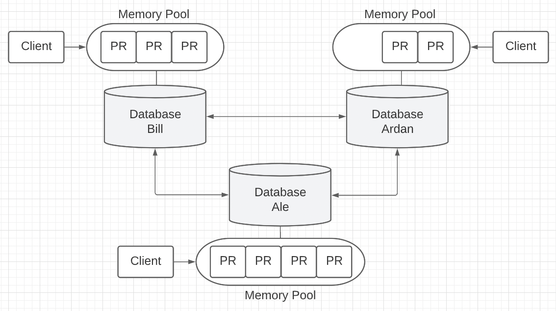 What’s more, clients talking to different databases could generate many pending records while consensus is taking place. These pending records need to be placed in a holding area until the next round of consensus starts. We could add a memory pool to the architecture to store these pending records.